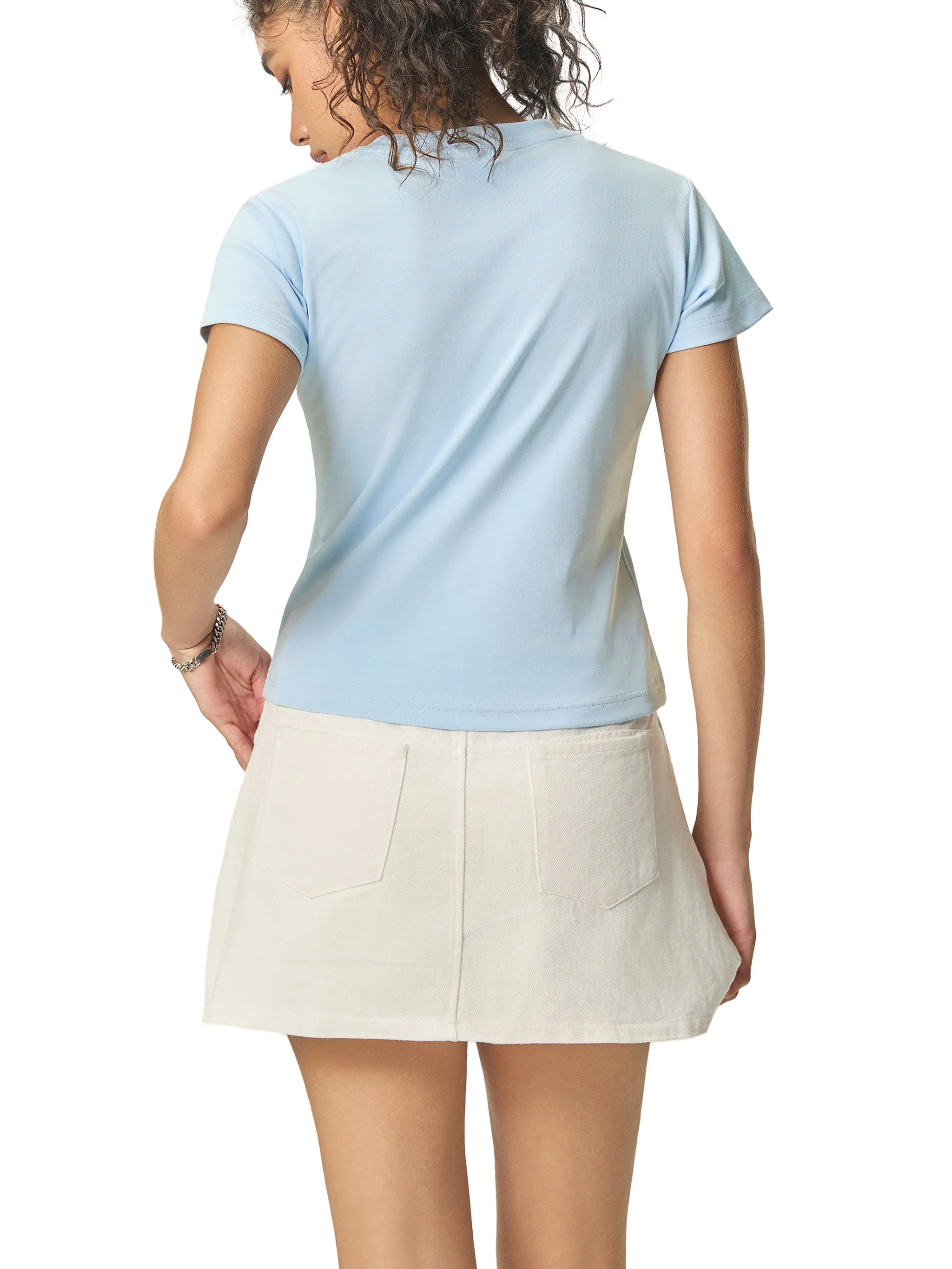The classic round neckline and short sleeves keep the look balanced and versatile, making it an easy foundation piece within a modern wardrobe.